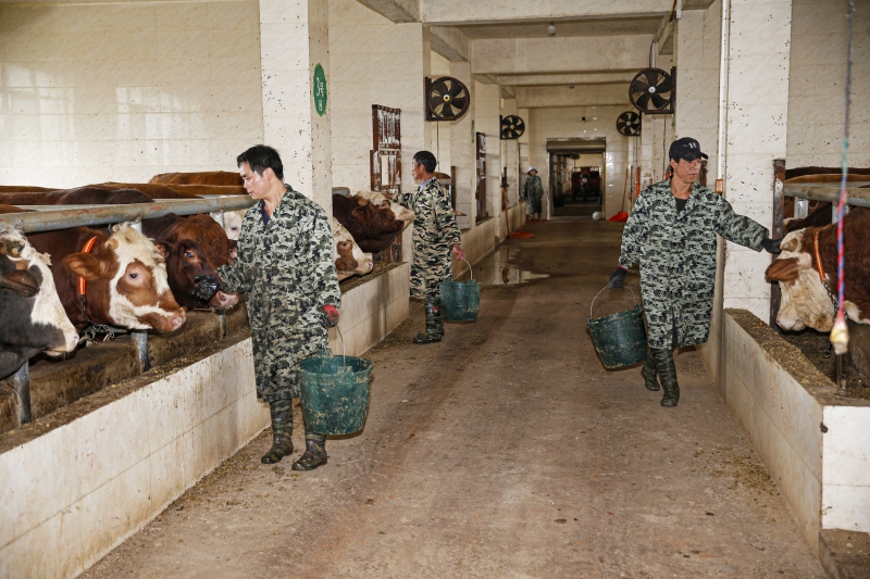 走進師宗恒才養(yǎng)殖場,場內綠樹成蔭,鳥語花香,果實累累,雞鴨成群,根本聞不到一點傳統(tǒng)養(yǎng)殖場特有的異味。站在養(yǎng)殖場大門的內側,養(yǎng)殖場負責人廖五七向記者介紹:“師宗恒才養(yǎng)殖場現(xiàn)肉牛存欄400多頭。去年,肉牛出欄650 頭,產值達850萬元,純利潤160萬元。我們采取‘肉牛+牛糞+有機肥+種植’的循環(huán)農業(yè)模式,種出來的玉米做成青貯飼料,青貯飼料喂牛,產生的糞便還田,水排泄物經過六級沉淀進入魚塘,實現(xiàn)了種植和養(yǎng)殖有機結合。”跟隨著負責人深入場區(qū),一路上,有的在喂牛,有的在粉碎甘蔗,有的在喂雞,有的在田里施肥,工人師傅們在各自的崗位上忙碌著。