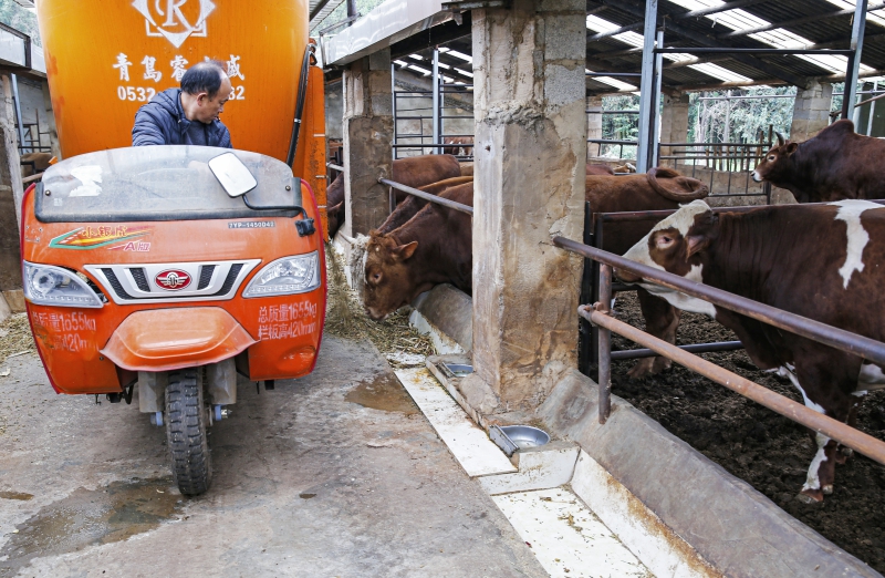 在丹鳳街道淑足村委會淑足村師宗長法養(yǎng)殖場,養(yǎng)殖場負責人袁長發(fā)正在開著全自動青貯飼料下料車在撒料。據(jù)同行的師宗縣畜牧獸醫(yī)局工作人員郭輝介紹:在師宗,袁長發(fā)算資格比較老的養(yǎng)牛專業(yè)戶,至今已有十多年的時間,加上他本人愛鉆研,善于學習,并總結出一套行之有效的養(yǎng)牛經驗,從幾頭到幾十頭,再到現(xiàn)在的一百多頭,他都是腳踏實地、一步一個腳印走過來的。據(jù)了解,去年,師宗長法養(yǎng)殖場出欄肉牛128頭,產值200萬元,純利潤50多萬元。 “在我的帶動下,現(xiàn)在我們村委會一共有50多戶養(yǎng)殖肉牛,存欄近2000頭。現(xiàn)在規(guī)模出來了,銷路也寬廣了許多,外省的客商來拉,也裝得起來,現(xiàn)裝現(xiàn)拉走”袁長發(fā)撒完飼料,從車上下來跟記者聊了起來。